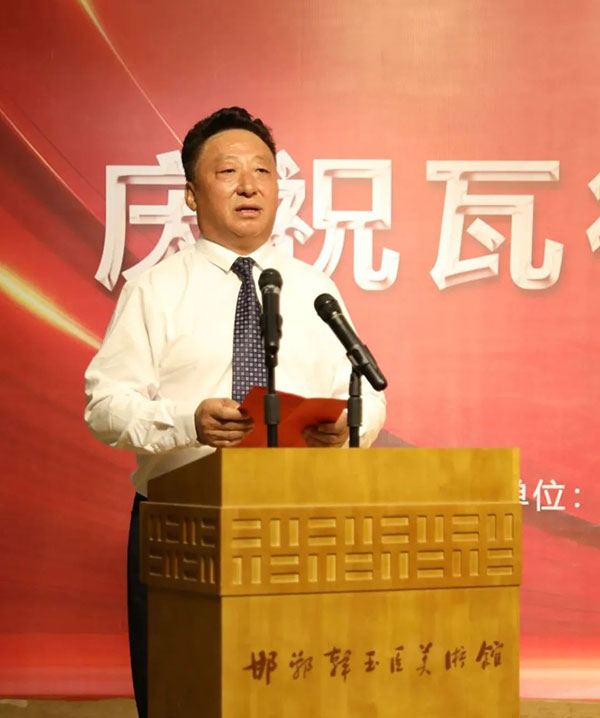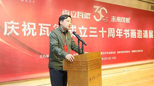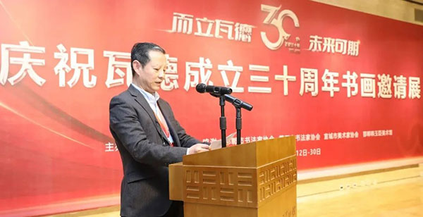 瓦德集團董事長謝富強向與會的各路藝術家及賓朋表達了熱情歡迎。向河北邯鄲、湖北黃石、安徽宣城三地文聯、書協、美協和書畫家們的大力支持表達了衷心感謝。尤其對中國知名書畫家,邯鄲市書協主席,文化名人,著名企業家韓玉臣先生對瓦德集團慶典活動的鼎力支持表達了深深的敬意和由衷地感謝。在三千年歷史的趙國都城邯鄲,能有瓦德集團如此注重文化藝術的實屬難得,能將深厚的中國文化的脈絡注入到自己的企業產品中非常難得。