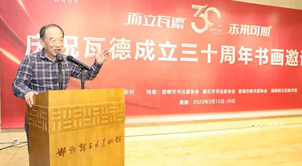 陽光集團董事長韓玉臣作了熱情洋溢的致辭,他對瓦德集團成立30年慶典表示熱烈地祝賀,對董事長謝富強自身藝術修養及瓦德企業的文化品位給予了很高的評價,對瓦德集團能傾力傾情舉辦如此規模的書畫大展,開創了邯鄲書畫界先河的行舉表示贊嘆。