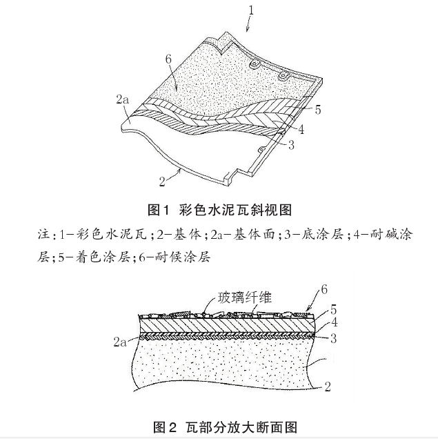 由上可知,由于在瓦基體面的著色涂層上再涂有含玻璃纖維的耐候性涂料,當日光紫外線接觸玻璃纖維,出現漫反射,阻止了日光射入著色涂層,有效保護著色涂層不受紫外線的影響,使著色涂層難以老化和褪色變色。涂層中的玻璃纖維還保護各涂層和瓦基體不受風雨的損害,延長瓦的使用壽命,瓦可以長久保持強度和美觀。總之,帶耐候涂層的彩色水泥瓦能長期經受惡劣的使用環境,不需要反復維修涂覆,商品價值得到提高。